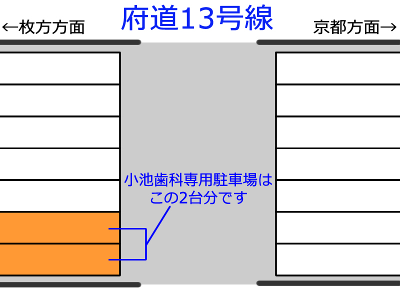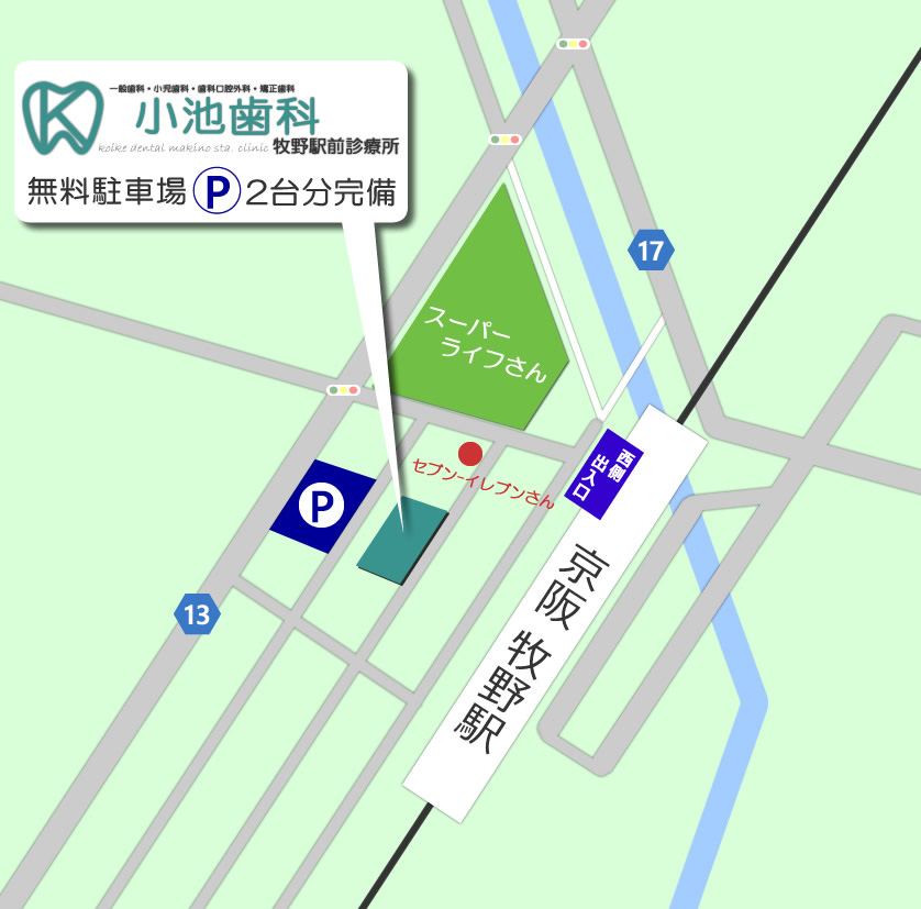 当院は京阪電車牧野駅から歩いてすぐの駅前にございます。また、府道13号線に面した駐車場に、ご来院の方は無料でご利用いただける2台分の当院専用スペースをご用意しておりますので、医院お近くの方はもちろん、電車やお車にて遠方からもご来院いただきやすくなっております。